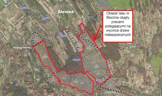 Pierwszym krokiem jest zapewnienie bezpieczeństwa turystom i odwiedzającym las. Dlatego w lesie w Słocinie rozpoczną się prace gospodarcze polegające na wyznaczeniu i usunięciu drzew zagrażających bezpieczeństwu powszechnemu. Nie są to prace o dużej intensywności, ale dzięki ich przeprowadzeniu będzie można w sposób bezpieczny korzystać z lasu i projektowanych w tym miejscu ścieżek i urządzeń turystycznych. Obszar leśny objęty pracami zaznaczono na mapach.